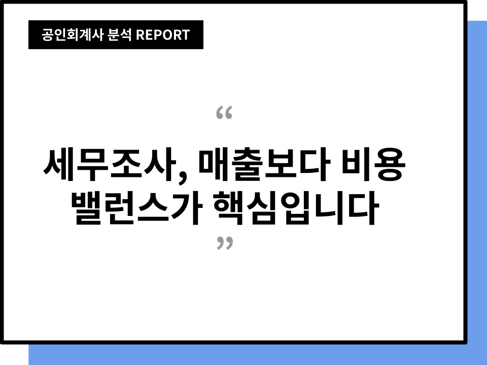 결국 세무 신고를 한다는 것은 우리 회사의 사업 구조를 국세청에 보고하는 행위입니다. 세무조사를 피하는 가장 좋은 방법은 장부를 깨끗하게 만드는 것이 아닙니다. 대표님이 속한 업종에서 평균적으로 인정하는 비용 규모, 그 흐름에 맞춰 움직이고 있는지 사업 자체의 밸런스를 계속 확인하는 것입니다. 예를 들어, 서비스업인데 인건비나 핵심 경비가 턱없이 낮다면 누가 봐도 이상합니다. 단순하게 절세 기술 몇 가지 익히는 것보다 이 근본적인 사업의 ‘균형’을 맞추는 일이 진짜 방어막입니다. 이 균형점을 혼자 찾는 일은 어렵습니다. 언제 터질지 모르는 세금 폭탄의 압력계를 상시로 확인하는 전문가, 그 역할이 바로 현장형 회계사의 일입니다. 사업은 대표님이 하십시오. 세금은 저희가 제대로 맡겠습니다.